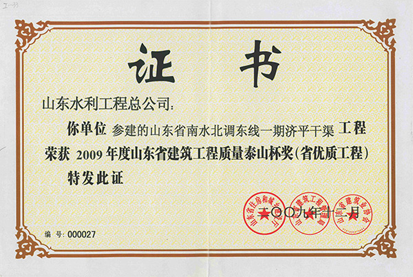 开云(中国)Kaiyun·官方网站"山东省南水北调东线一期济平干渠工程"荣获2009年度山东省建筑工程质量泰山杯