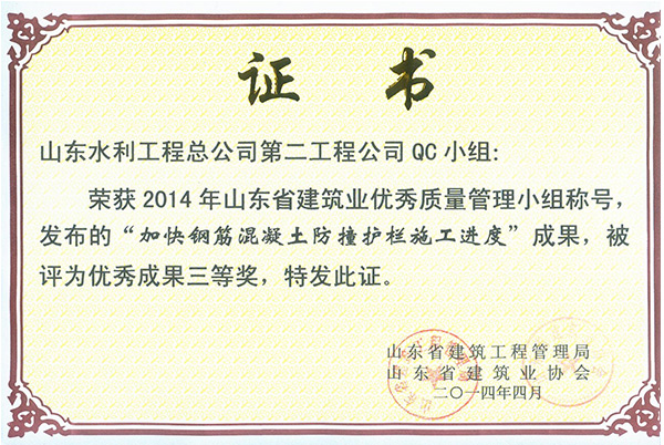 开云(中国)Kaiyun·官方网站“加快钢筋混凝土防撞护栏施工进度”荣获2014年山东省建筑业优秀质量管理优秀成果三等奖