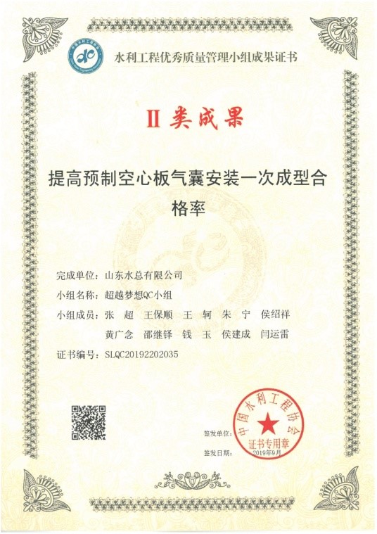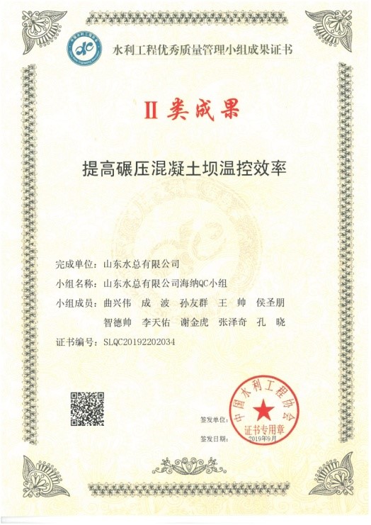 2019年9月24日,由中国水利工程协会举办的2019年度中国水利工程优秀质量管理小组成果发布,开云(中国)Kaiyun·官方网站报送的《提高碾压混凝土坝温控效率》和《提高预制空心板气囊安装一次成型合格率》2项成果全部获Ⅱ类成果奖。