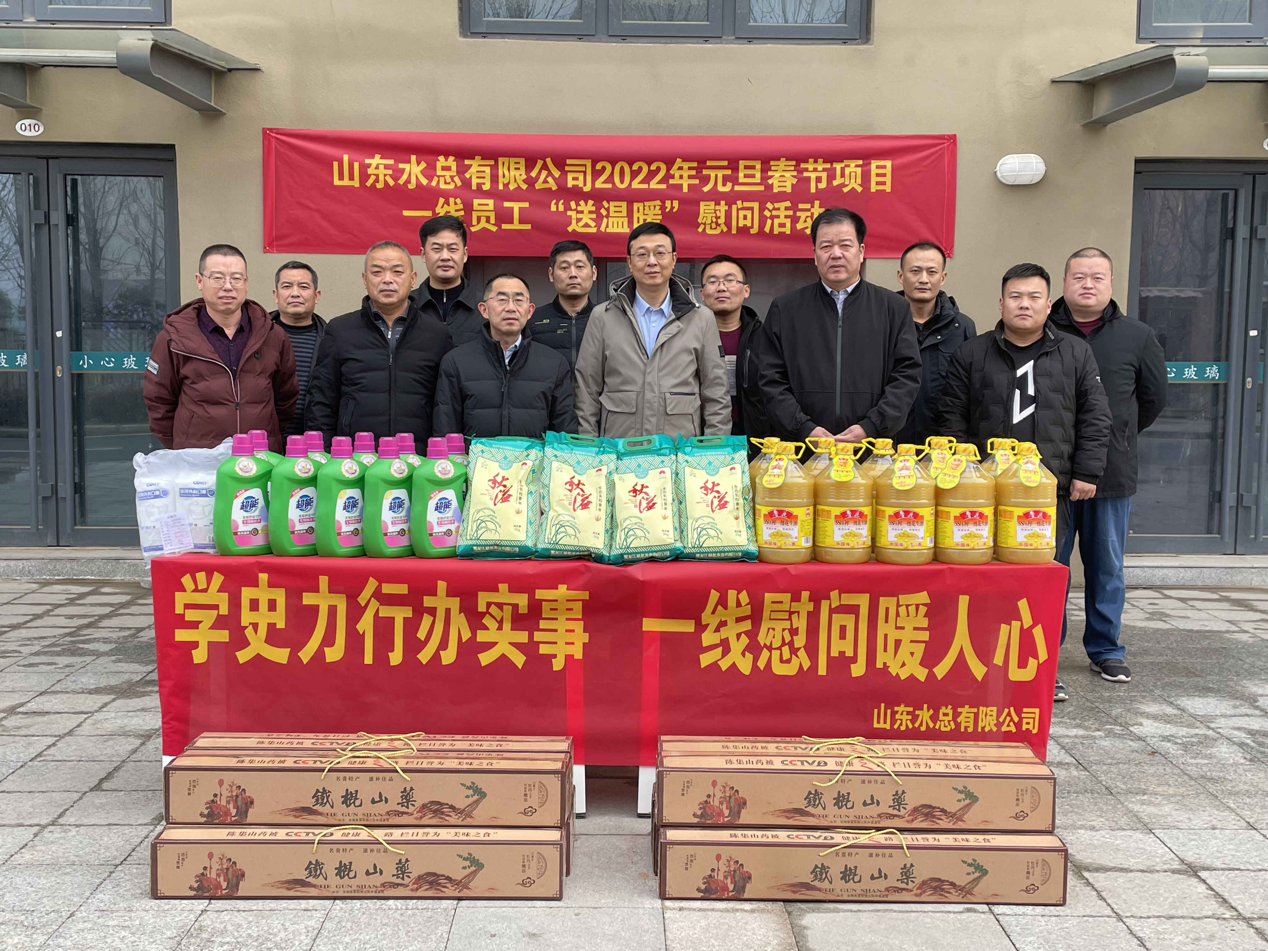 最后,领导们在项目现场给工地一线人员发放慰问品,把温暖与祝福送到在场人员的心坎上。
