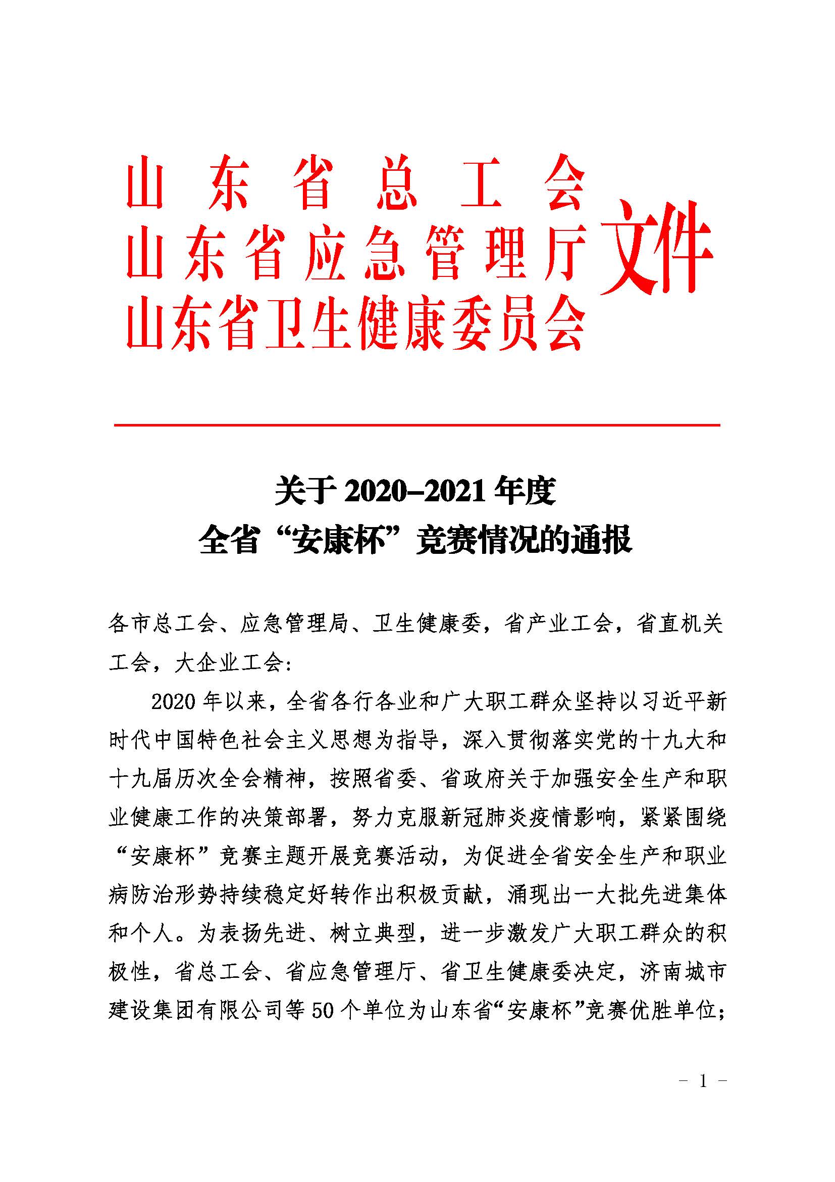 近日,山东省总工会、山东省应急管理厅和山东省卫生健康委员会联合印发文件,通报了2020-2021年度全省“安康杯”竞赛活动结果,开云(中国)Kaiyun·官方网站荣获全省“安康杯”竞赛优胜单位称号。