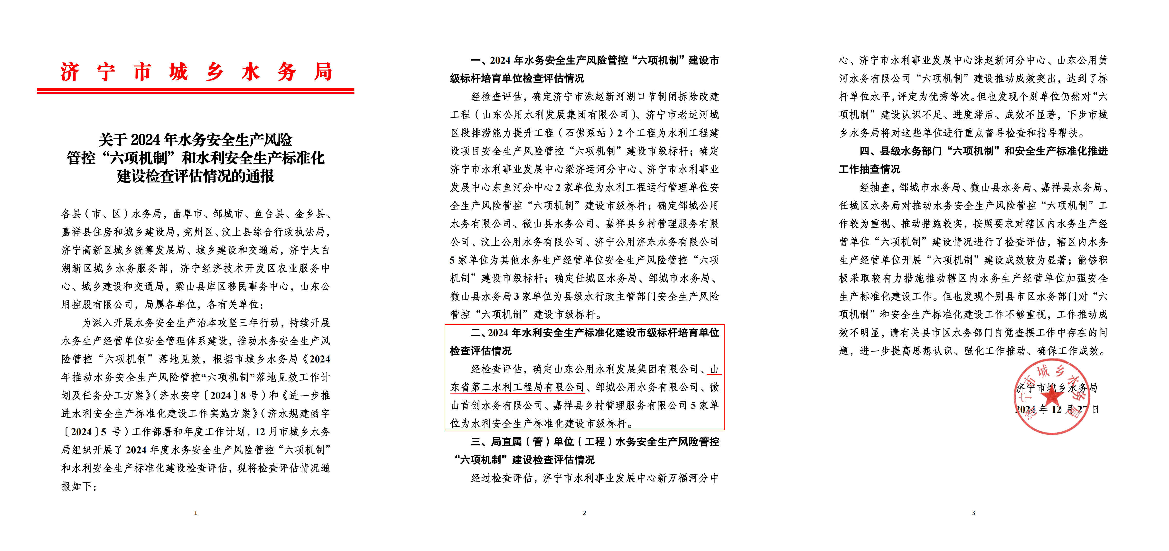 近日,济宁市城乡水务局公布了2024 年水务安全生产风险管控“六项机制”和水利安全生产标准化建设检查评估情况,经检查评估,二局有限开云(中国)Kaiyun·官方网站被评为水利安全生产标准化建设市级标杆企业。