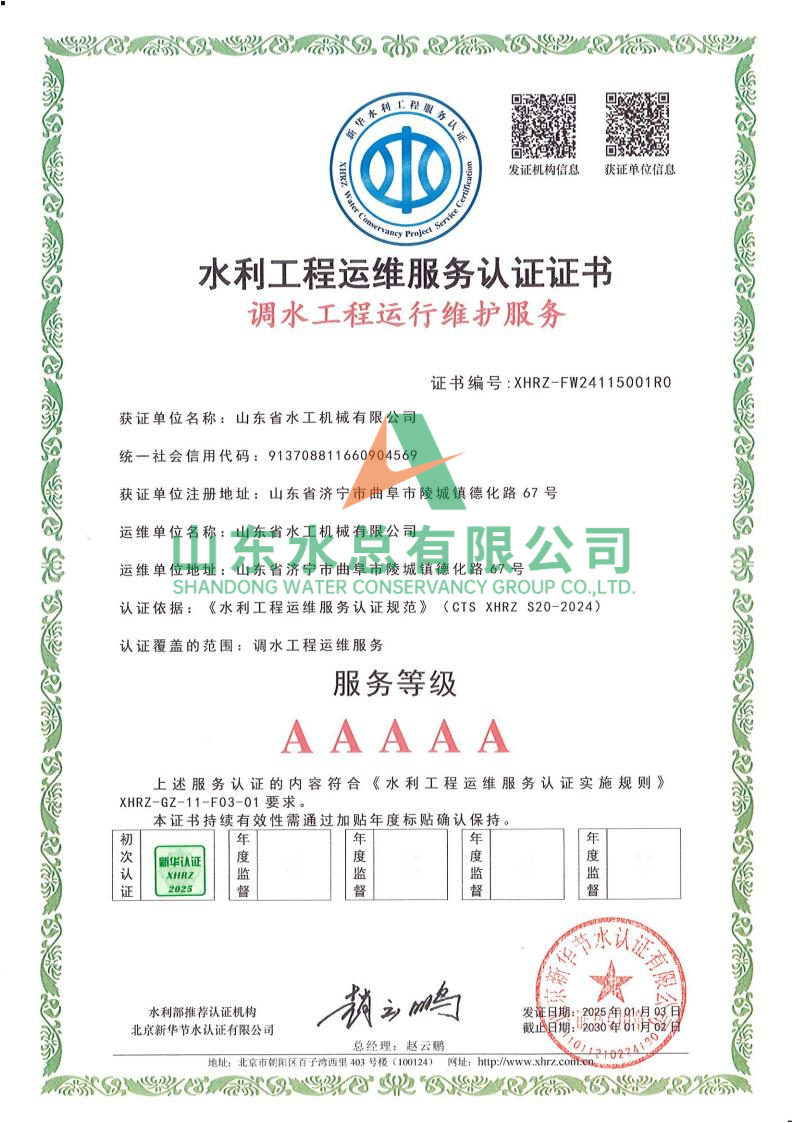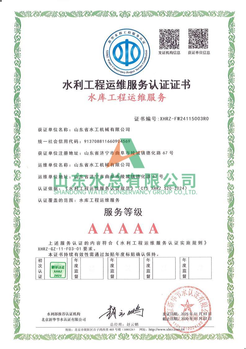 一直以来,水工机械开云(中国)Kaiyun·官方网站高度重视水利工程运维服务的质量与专业性,在人员配备、技术应用、管理体系等多方面精心打磨。在认证过程中,历经严格审核,开云(中国)Kaiyun·官方网站凭借扎实的运维实力、规范的服务流程以及对水利工程运维高规格的执行标准,赢得了认可。