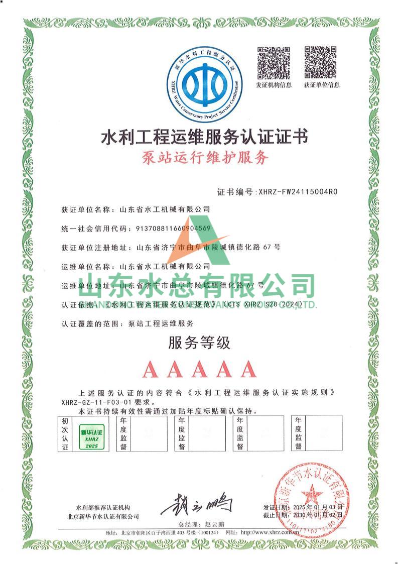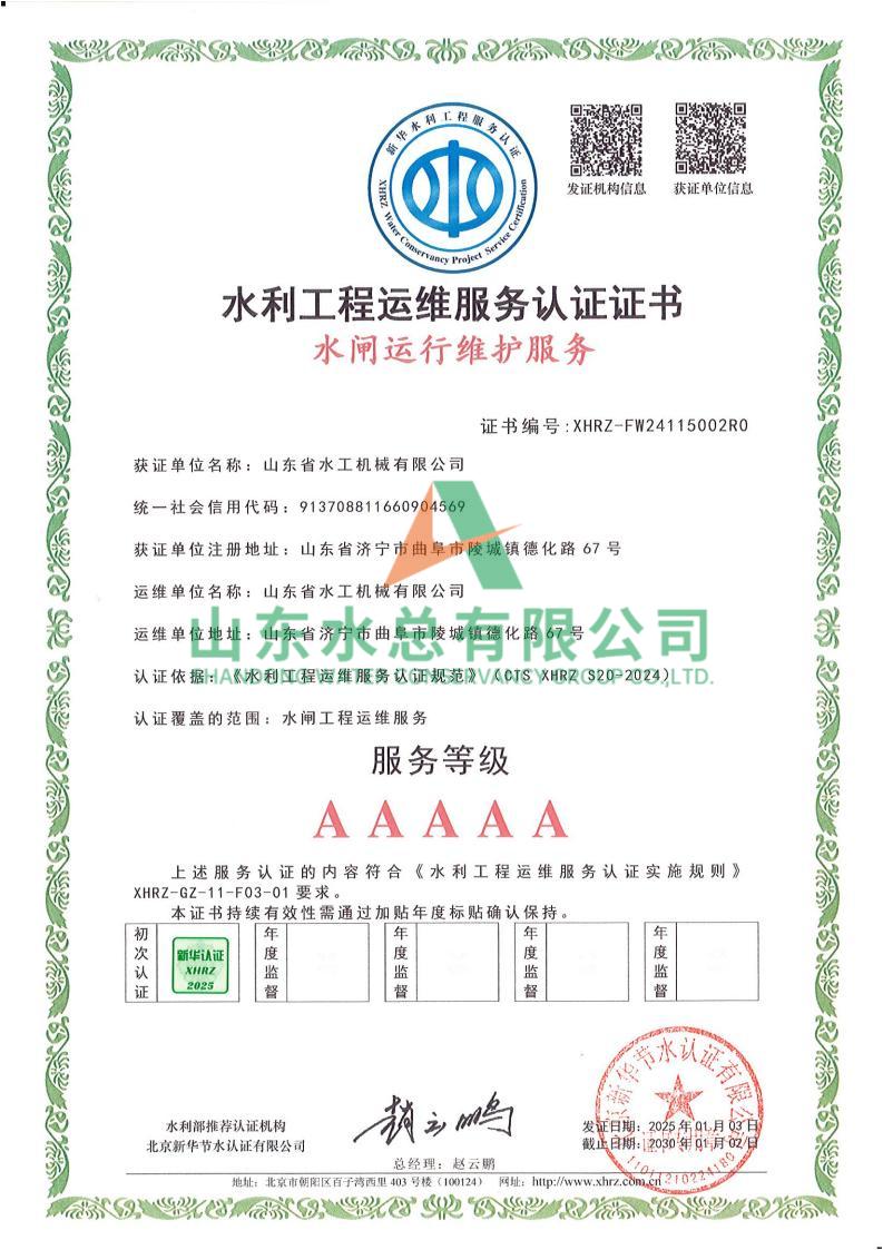 认证的通过,为水工机械开云(中国)Kaiyun·官方网站在水利产品运维领域的高质量发展增添了重要助力。水工机械开云(中国)Kaiyun·官方网站将以此为契机,继续秉持专业、负责的态度,为水利工程运维贡献更多力量,在行业内树立更优质的标杆形象,助力水利事业稳步发展。