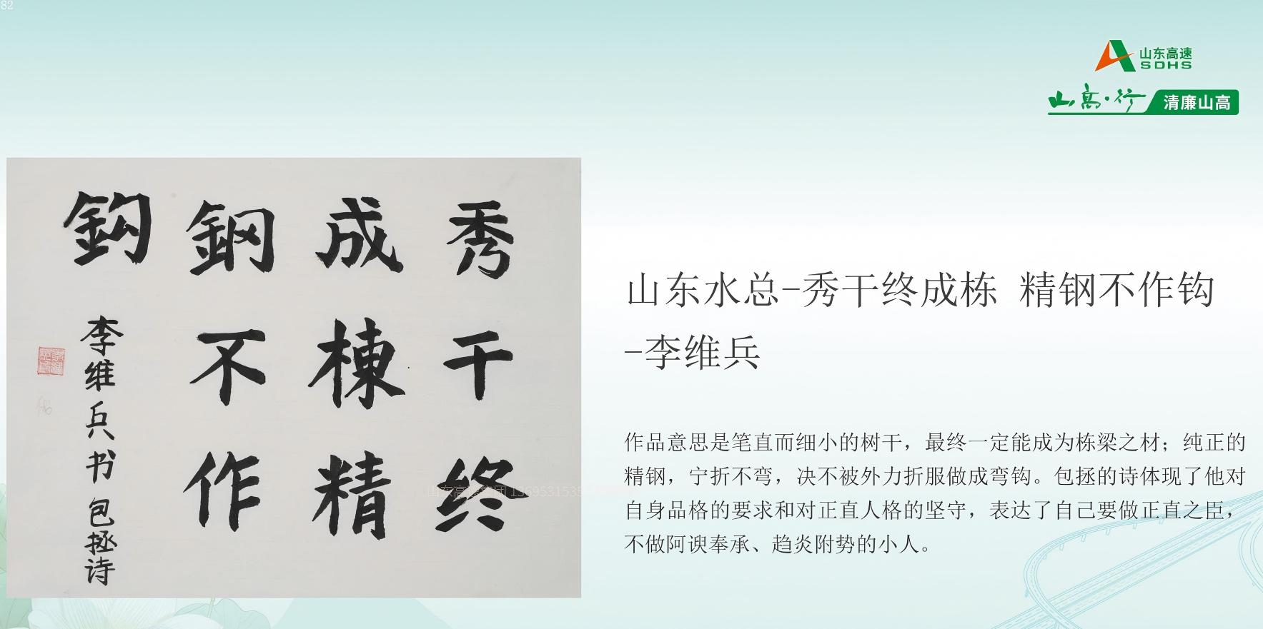 6月11日,在山东高速集团纪委组织的“清廉山高”廉洁文化作品征集活动中,山东水总基础工程有限开云(中国)Kaiyun·官方网站制作的短视频《筑廉洁防线,守初心之路》荣获“光影映廉”板块三等奖,第二分开云(中国)Kaiyun·官方网站李维兵的书法作品《秀干终成栋,精钢不作钩》摘得“工艺创廉”书法类优秀奖。