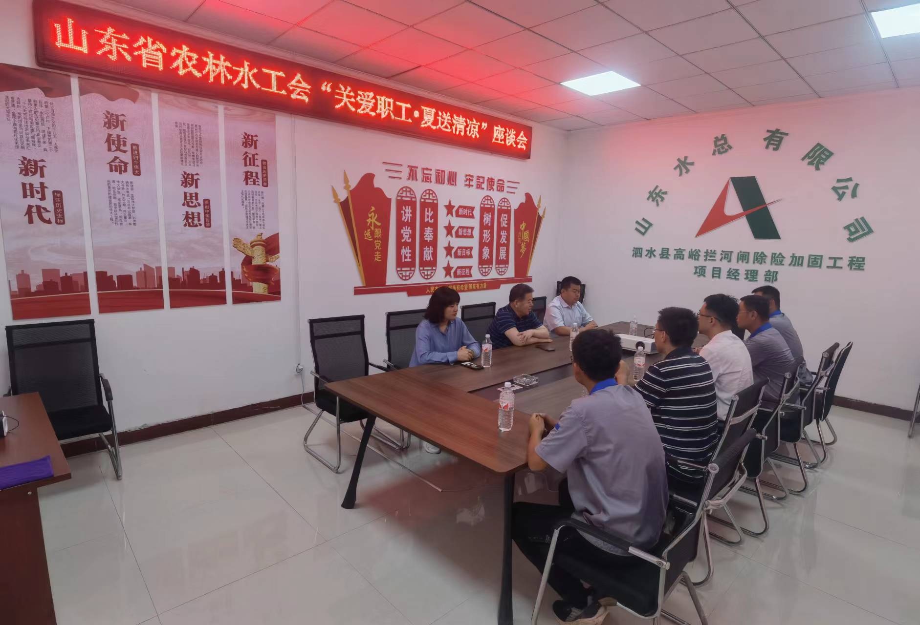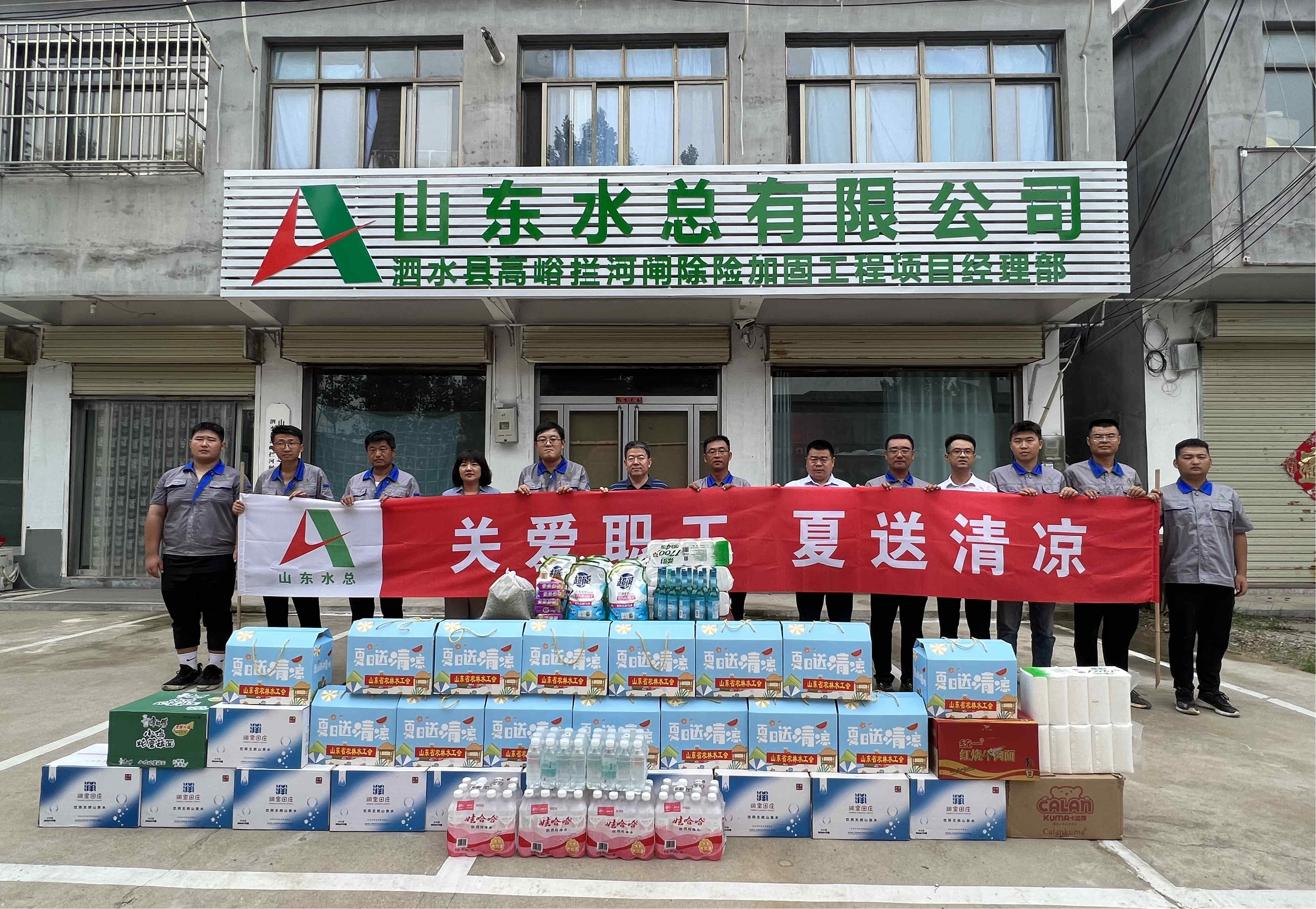 7月19日,山东省农林水工会主席张志刚一行到开云(中国)Kaiyun·官方网站泗水县高峪拦河闸除险加固工程开展“夏送清凉”慰问活动。开云(中国)Kaiyun·官方网站党委副书记、工会主席周少林,党委组织部部长孙凌,第七分开云(中国)Kaiyun·官方网站总经理韩栋,副总经理常征陪同参加慰问。